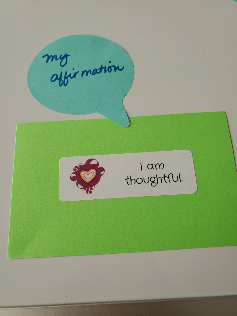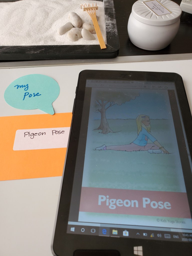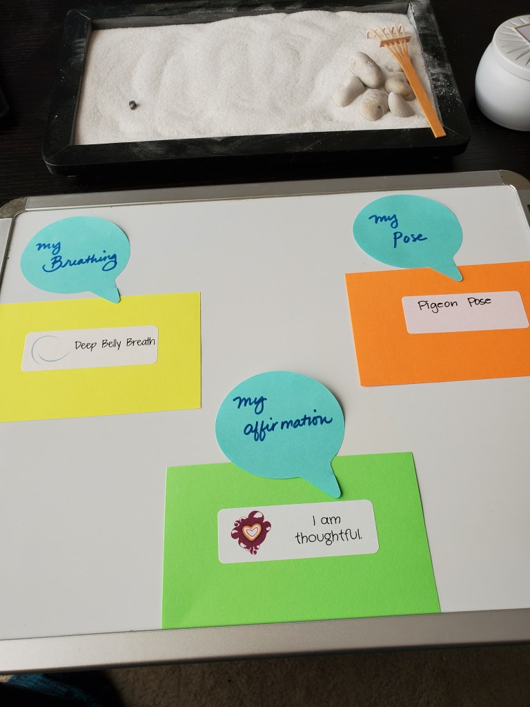 - List of breathing exercises, yoga poses, and positive affirmations – I used resources purchased through www.kidsyogastories.com, but you can find free websites, such as https://copingskillsforkids.com/deep-breathing-exercises-for-kids. Positive affirmations can be created on your own or you can also find examples online (example: https://www.thepathway2success.com/101-positive-affirmations-for-kids/). Yoga poses can also be found free online (https://www.yogajournal.com/poses/yoga-for/kids)